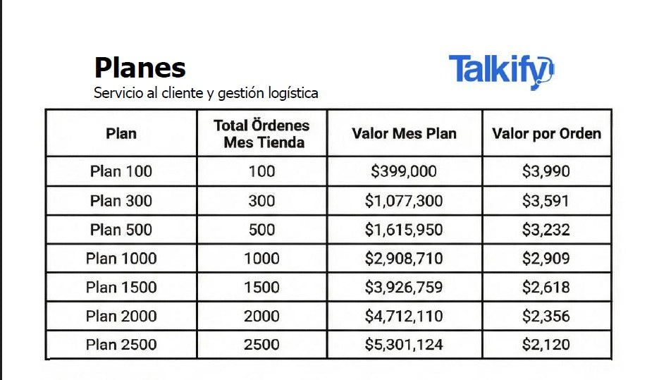 En Talkify, somos un equipo especializado en operaciones para tiendas de comercio electrónico. Nuestra misión es ayudarte a escalar tu negocio sin que tengas que preocuparte por la parte operativa. Nos encargamos de todo el proceso: atención al cliente, trazabilidad de pedidos, gestión con proveedores y asesorías estratégicas.